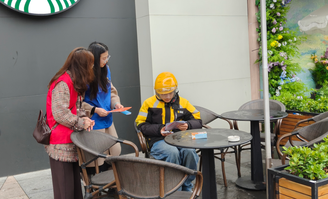 “您好,您在美团平台工作有多长时间了?您了解职业伤害保障吗?”工作人员主动询问外卖小哥,了解他们的需求,耐心讲解新就业形态人员职业伤害保障政策,告知其是什么,有什么用,怎么办理等,为新就业形态人员提供面对面答疑解惑。
